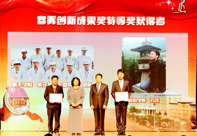 张淑荣、王树权为春晖创新成果奖特等奖获得者万龙、学生微纳卫星团队颁奖(冯健 摄)