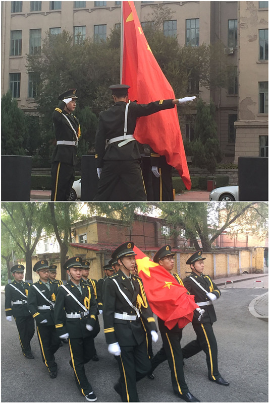 齐步走到旗杆附近,他们停下了。为表示对国旗的尊敬,旗杆下的步伐要换为正步。国旗班的成员都是普通的学生,整齐的正步来自于过去一年的练习。旗杆下再次停下,三人旗手组上前升旗,九人方队在下行注目礼。嘹亮的国歌打破了清晨的安静,鲜红的国旗在国歌中缓缓升起。敬礼口令一下,九人方队迅速而整齐地行军礼,坚持着高质量地完成每一次的升旗任务。