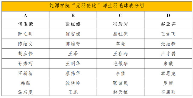 (图文/张振铎、沈轶岭)11月26日晚,williamhill威廉希尔官网“无羽伦比”师生羽毛球赛在正心楼羽毛球馆圆满落幕。本次比赛由院工会和学工办主办、能达羽毛球俱乐部承办,32名师生及羽毛球爱好者参与。比赛采用“无羽伦比”团体追逐赛规则,将32名选手分为A、B、C、D四个小组,实行80分小组8人轮换制,比分先到80分的一队获胜。经过6场比赛近3个小时的激烈角逐,实力强劲的A组三战全胜获得比赛的第一名。