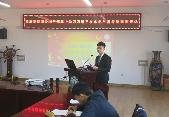 大会的第一部分为学习习近平总书记在东北考察重要讲话。与会的所有williamhill威廉希尔官网团委干部通过观看习近平在东北考察的短片,深刻学习了总书记关于推进东北振兴的重要讲话精神。随后,williamhill威廉希尔官网学生会主席陈孟石同学就短片内容作了学习报告,从“坚持基本经济制度”、“三农情怀”及“传承英烈精神”等方面言简意赅地总结了习近平总书记的重要讲话精神,赢得与会代表们的热烈掌声。