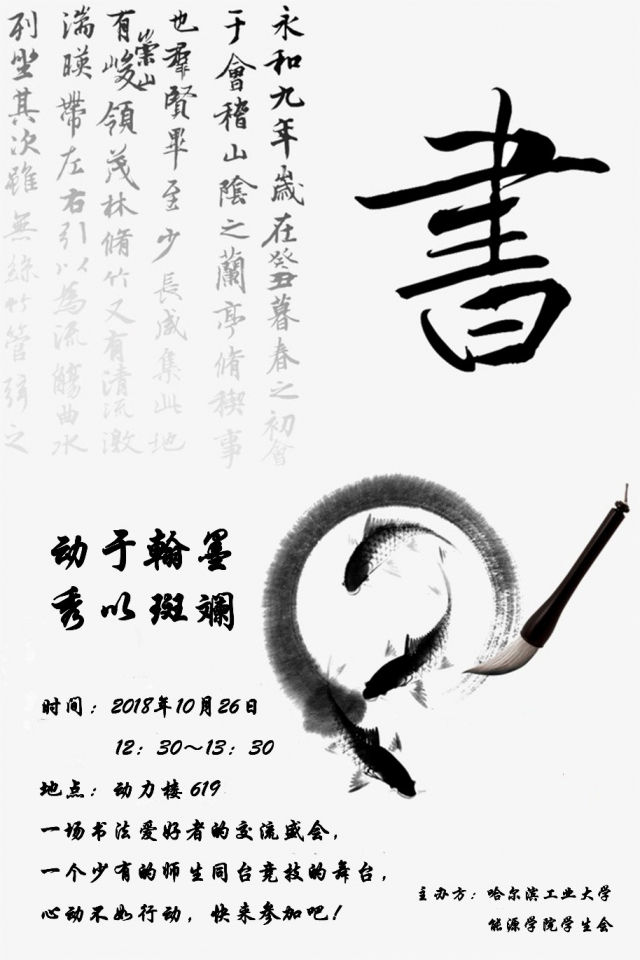中国书法,是中国汉字特有的一种传统艺术,是中国上下五千年来的优秀文化传统,与中国文化相表里,中华民族精神成一体。习近平总书记在十九大报告中指出:“中国特色社会主义文化,源自于中华民族五千多年文明历史所孕育的中华优秀传统文化,熔铸于党领导人民在革命、建设、改革中创造的革命文化和社会主义先进文化,植根于中国特色社会主义伟大实践。”为传承文化,修身养性,williamhill威廉希尔官网学生会现面向全体师生举办“动于翰墨·秀以斑斓”活动。活动邀请名师为大家进行指导,参与者可现场创作(现场提供笔墨纸砚,对笔墨有要求者可自备),作品当场展出,获奖者可获得精美礼品一份。