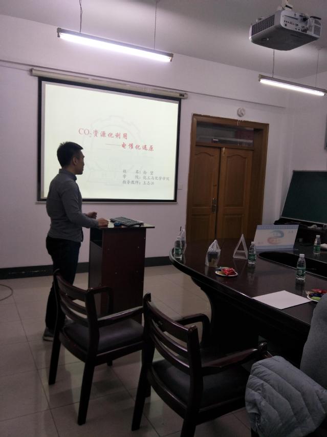为了增进不同科研领域之间的学术交流,进一步提升研究生胡科研能力,本次活动特意邀请了化工学院燃烧所的孙堃博士为大家讲解有关复合材料的制备与电催化还原CO_2性能研究,同学们认真学习,仔细记录;积极提出自己的问题与困惑,孙堃博士都一一进行了解答。而后高建民老师和杜谦老师对同学们进行更加详细的指导,同学们受益匪浅。