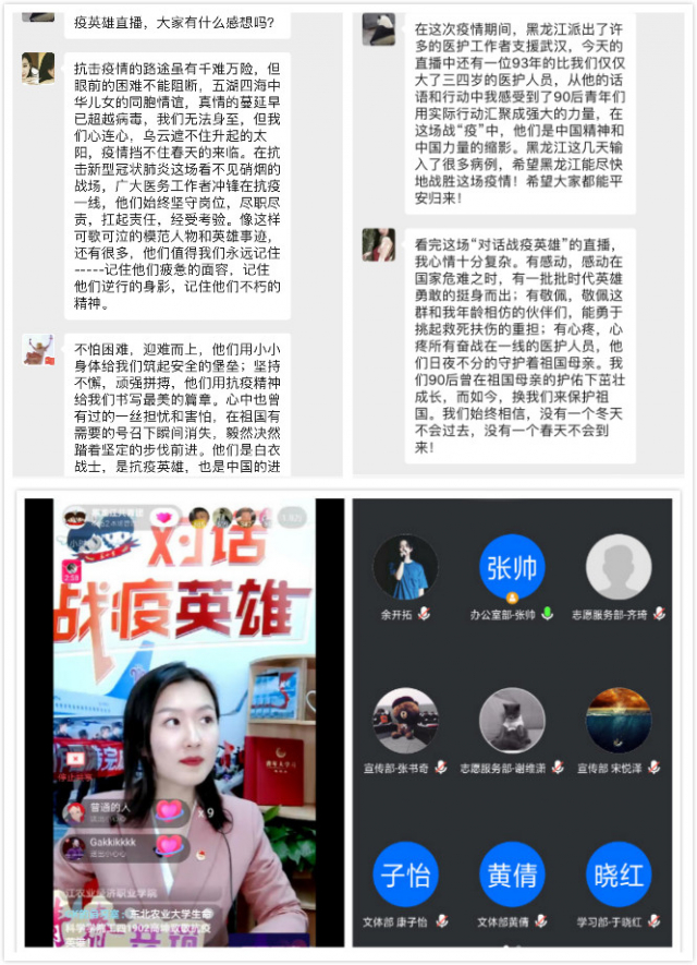 4月9日williamhill威廉希尔官网团委组织同学借助腾讯会议转播抖音黑龙江共青团“对话抗疫英雄”节目,并利用腾讯会议聊天区进行讨论。