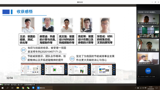 特等奖获得者王进感慨道:“这次比赛我们小组能够获得特等奖这么好的成绩,我们也感到很意外,但也很荣幸。由于疫情的影响,导致我们小组成员只能在家里进行线上工作,各司其职,克服种种困难,寻找可能利用上的资源为比赛做准备。非常感谢何老师,汪老师还有众学长们对我们的悉心教导,为我们的比赛准备进程认真把关,提供自己的经验。也非常感谢各位评委老师认可我们的作品和努力,这次比赛的经历,我们小组成员也积累了丰富的经验,为以后进行科研实验打下坚实的基础,我们未来也一定会更加努力。”齐琦小组的成员感叹道:“本次节能减排大赛中本组项目能够获得一等奖,首先感谢的是我们的小组成员们,一起的努力,相互的鼓励与支持,以及为责任的自告奋勇的付出,过程或许很难,但真心的付出得到的结果会是成正比的。也非常感谢指导教师高继慧老师,跟随高老师在整个项目完成过程中,我们收获的不只是项目的结果而已,更多的是在完成一个项目时所应该具备的能力、技能以及思考思维方式。也希望在项目后续完善过程或者新项目的推进都能够在节能减排、资源高效利用等方面发挥更多的价值作用。” 王俊杰小组成员说:“面对疫情不能返校的阻碍,我们因地制宜,积极开展居家实验,在有限的条件下,想方设法的克服困难;同时老师对我们的帮助至关重要,每当我们遇到技术难题时,老师总能通过线上会议为我们排忧解难,给我们打开新的希望之门。在整个参赛过程中,小组成员可谓收获满满,也结下了团结协作的宝贵情谊。”