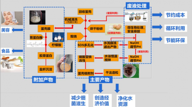 项目介绍:垃圾处理的方式有很多,其中我们最常接触的是填埋和焚烧,但这两类处理方式都会造成环境污染。进一步调查发现了生活中那些每天都被扔掉的蛋壳,这些蛋壳废弃量很大。本团队将废弃蛋壳进行预处理,再经过多孔化处理和化学物理的改性来丰富蛋壳的比表面积和孔隙结构,再通过干法造粒技术达到成型处理的目的。我们的产品相较于一些价格高,且会带来二次污染的吸附材料而言具有原料易获取经济成本低,吸附性好,且不会产生二次污染的等优势。本团队以新工艺制备的新型吸附材料成本低廉,效果优良。该吸附剂可以处理工业污水,吸附效果优于当前市面上的建议吸附剂,但是成本低廉,获利前景巨大,达到了生活中的节能减排的目的。
