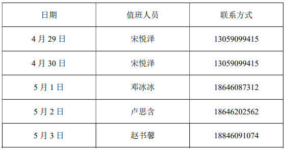 为便于学生紧急事件联系,现将williamhill威廉希尔官网学生工作办公室假期值班安排予以公布,同学们如遇紧急事件请及时联系辅导员或值班老师,详见下表: