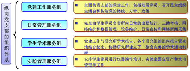 2004年,williamhill威廉希尔官网燃烧工程研究所率先在学院创立了按研究所建立研究生党支部的新模式,到2009年1月,学院实现了全体研究生都以研究所为单位成立纵向党支部。实践证明,纵向党支部模式能够克服横向党支部的一些不足,打破了年级界限,支部的稳定性和传承性明显增强;凝聚了相同学科方向的研究生党员,更有利于支部活动的开展和深入;实现了以党建带科研、以科研促党建的良好局面,使研究生党支部焕发新的活力。其中燃烧所研究生党支部并作为基层党支部代表在学校党建工作案例报告会、践行社会主义核心价值观报告会上做典型发言,并多次获得校先进基层党组织十佳等荣誉称号。